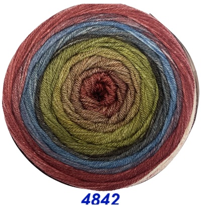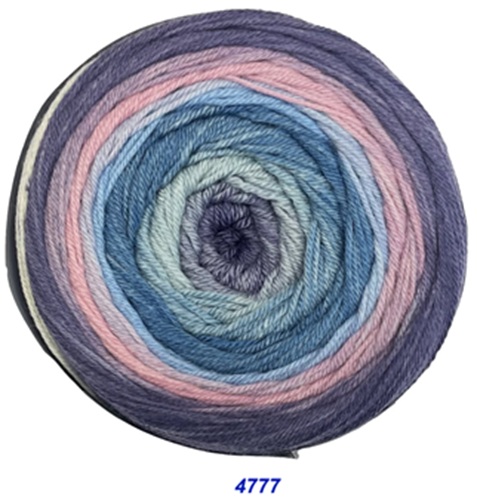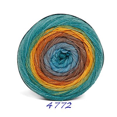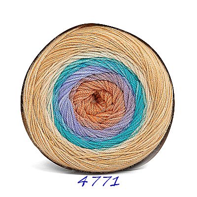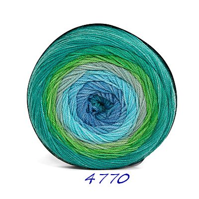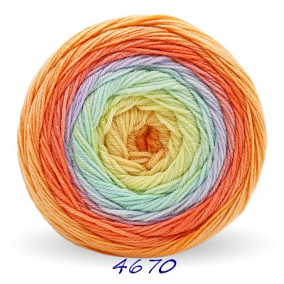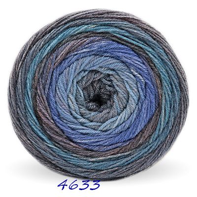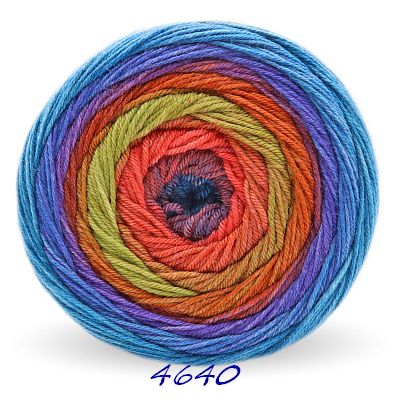 Das 200g Knäuel besteht aus nur einem extralangen Farbverlauf. Es beginnt und endet mit der gleichen Farbe, so daß ein Ansetzen eines weiteren Knäuels ohne Rapportunterbrechung ermöglicht wird. Wobei der weiße Faden am Anfang und Ende abgeschnitten werden muss.